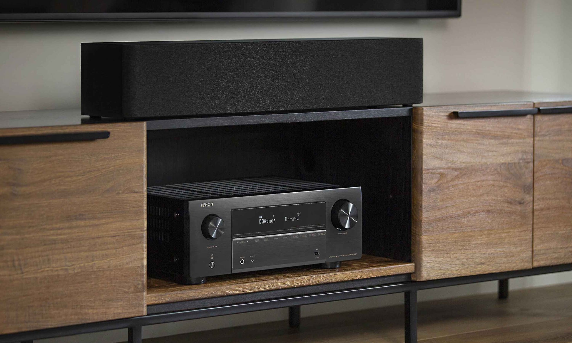 A Denon AVR-X2800 7.2 Channel 8K Audio Video Receiver is the heart of the system, providing power to all the speakers and being the switching point for all your audio and video sources.