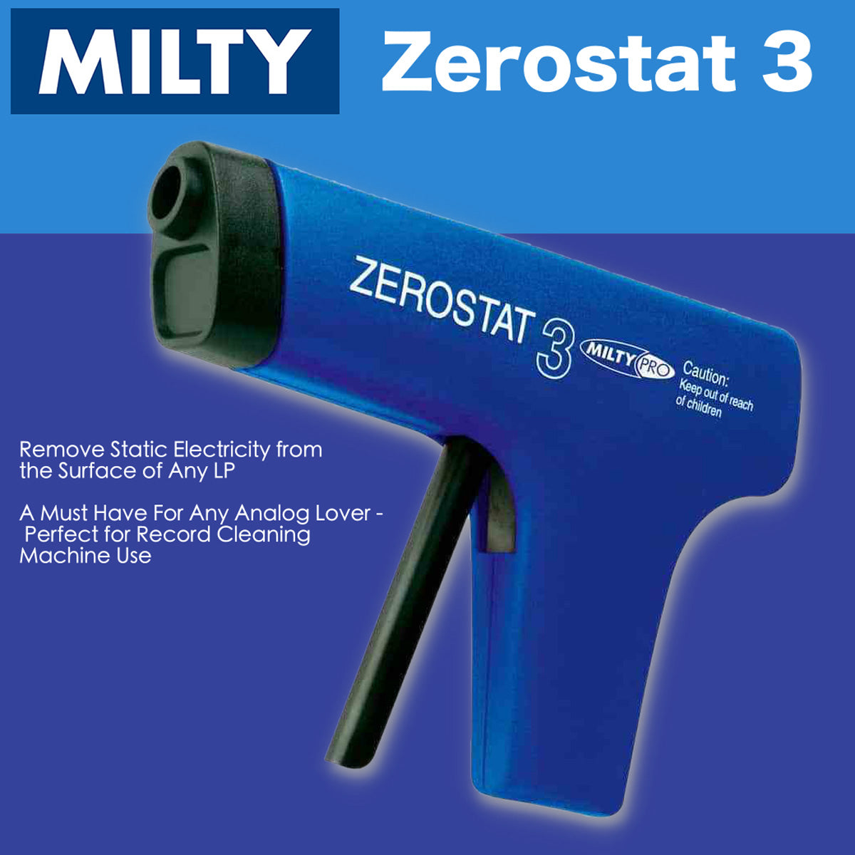 The Milty Zerostat 3 Pistol is designed to improve the sound quality of both records and CD's. It is completely effective at neutralising static charges on virtually any surface without any nasty sprays, the Milty Zerostat 3 is the pistol to use when your enemy is static and dust.