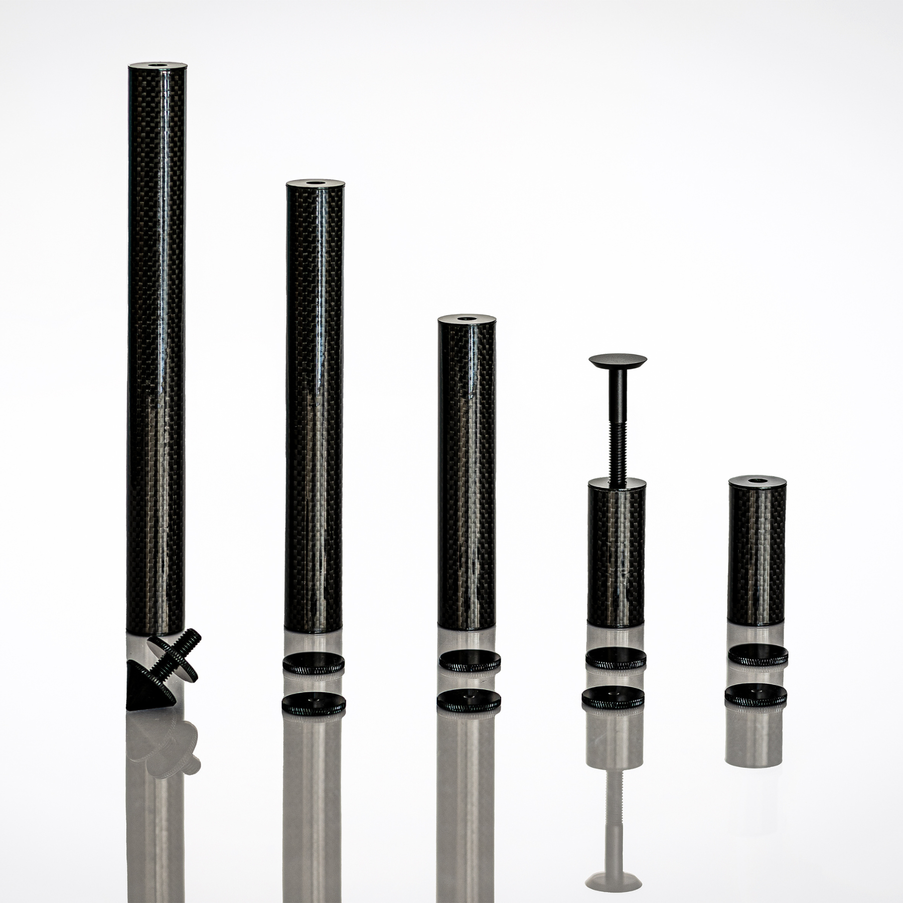 PlenQ only uses carbon (3K cloth) reinforced glass fibre columns. The columns are interconnected with a threaded rod in a custom-made, anchored aluminium part inside the column. There are no visible screws, bolts, springs, washers, or nuts anywhere on PlenQ’s hi-fi furniture. The columns have a diameter of 25 mm and are available in 4 heights, 60, 130, 180 and 240 mm. The 60 mm high column is placed under the bottom platform and fitted with a spike and lock nut.